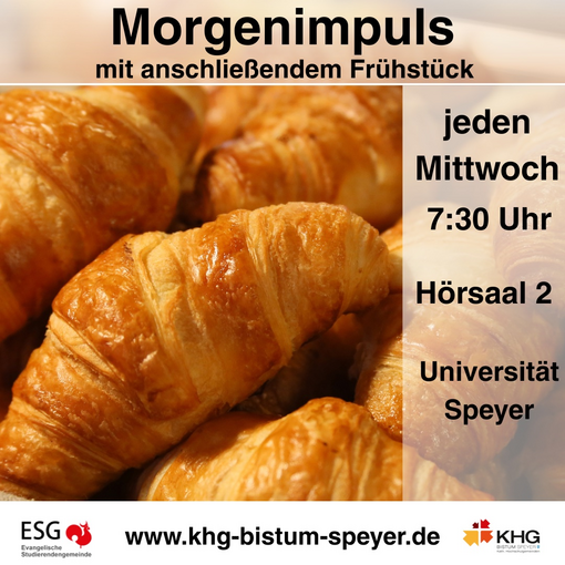 Mittwoch, 21.01.2026 Uhrzeit: 07:30 Uhr - 08:30 Uhr Universität Speyer, Hörsaal 2SP | Morgenimpuls mit Frühstück